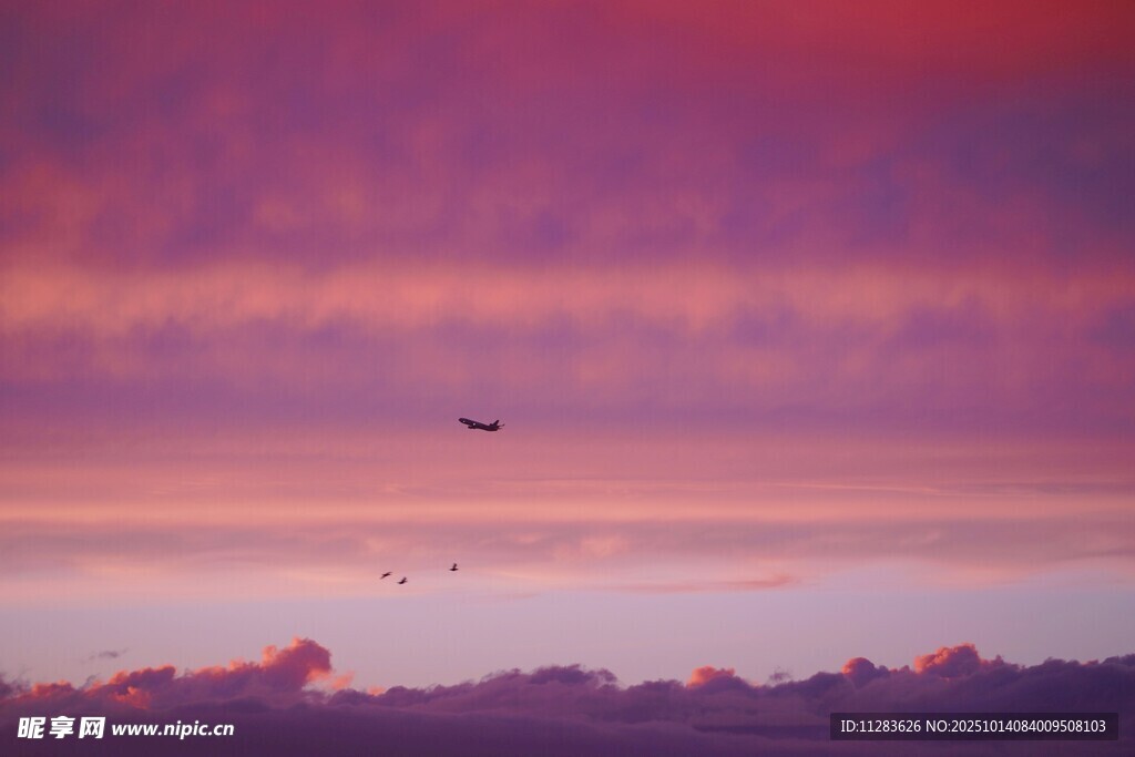 晚霞中飞鸟翱翔的天空图片