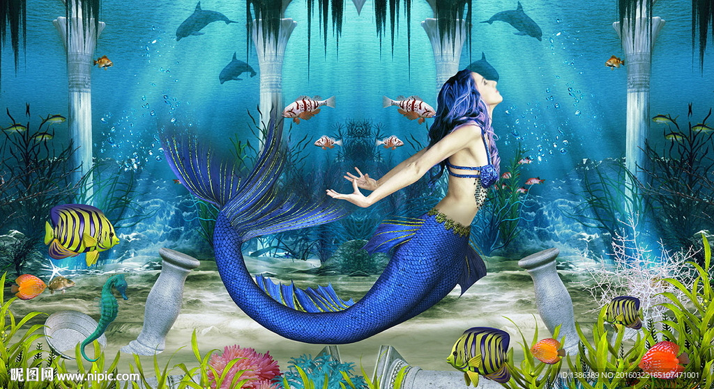 唯美海底世界蓝色美人鱼写真背景图片