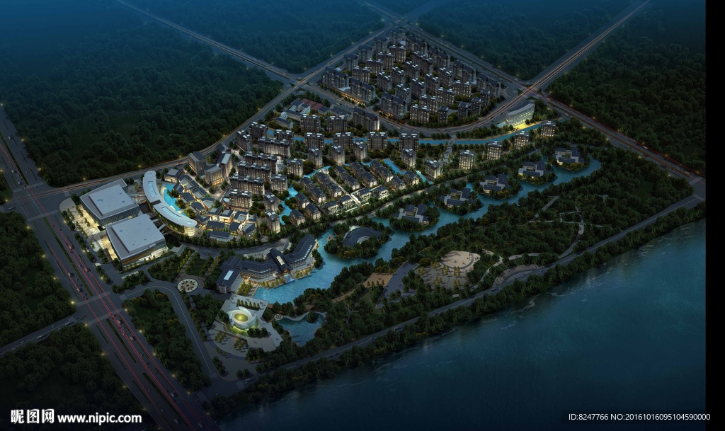 别墅住宅区夜景鸟瞰建筑效果图图片