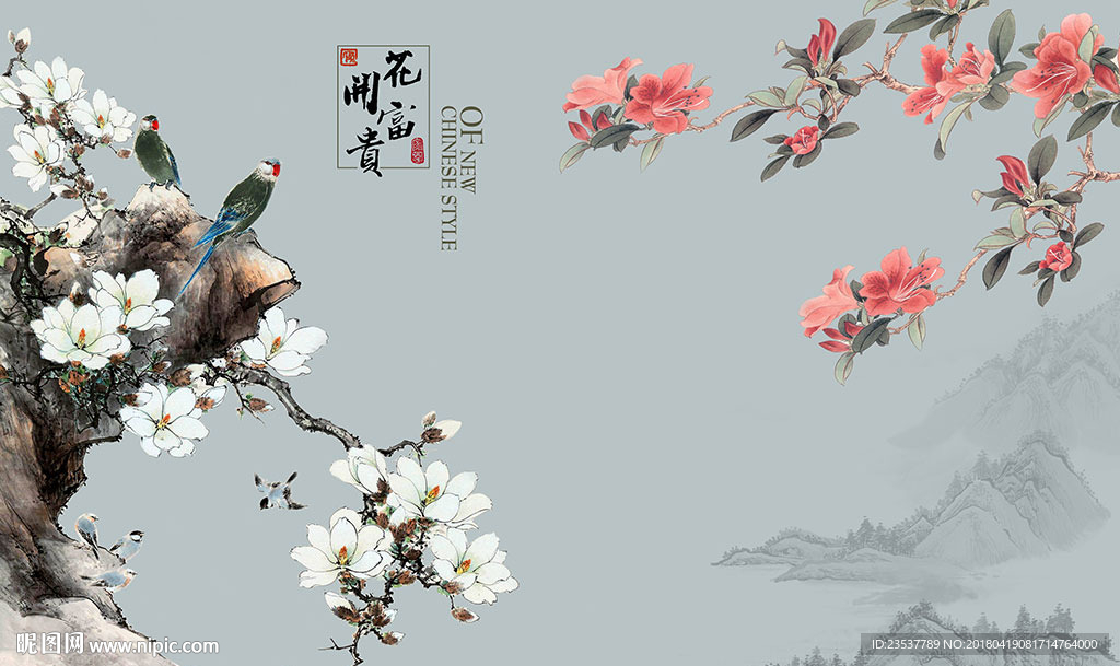 花开富贵山水花鸟中式电视背景墙图片
