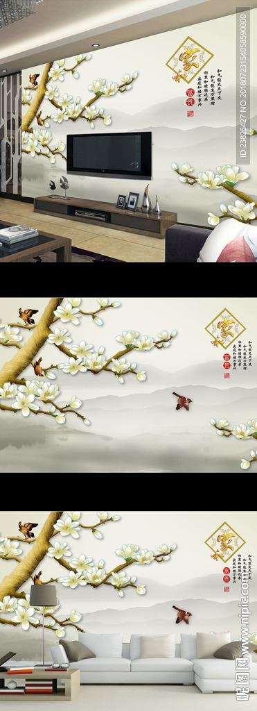 新中式玉兰花鸟山水电视背景墙图片