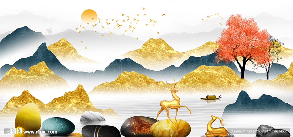 中式石来运转麋鹿山水晶瓷装饰画图片