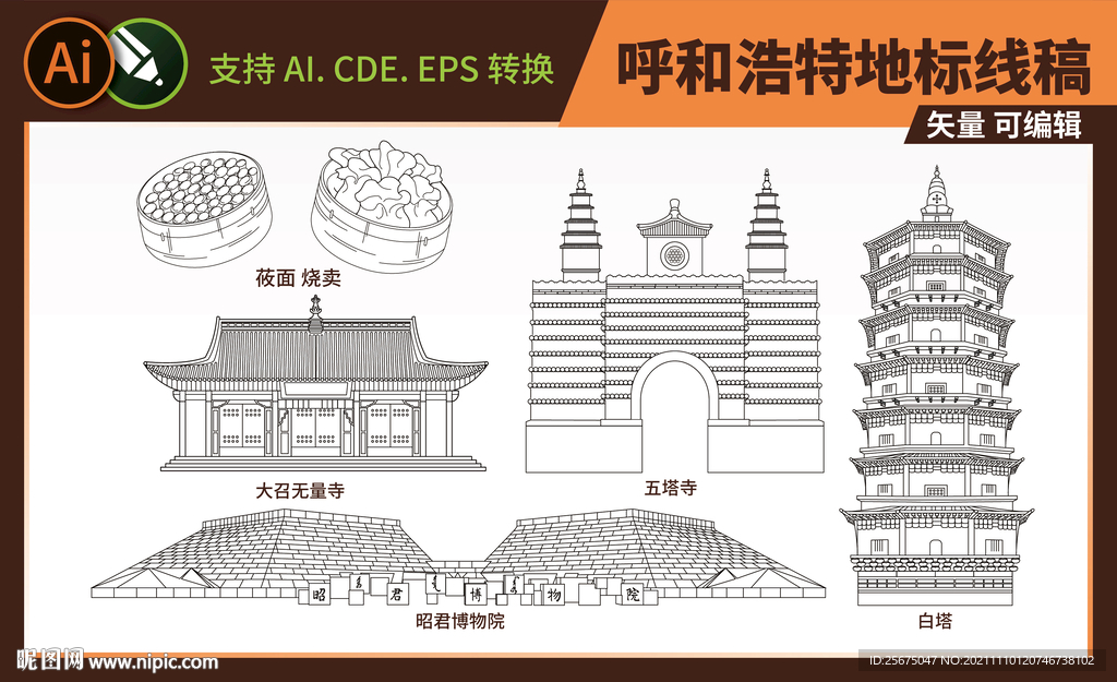 内蒙古呼和浩特市地标建筑线稿图片