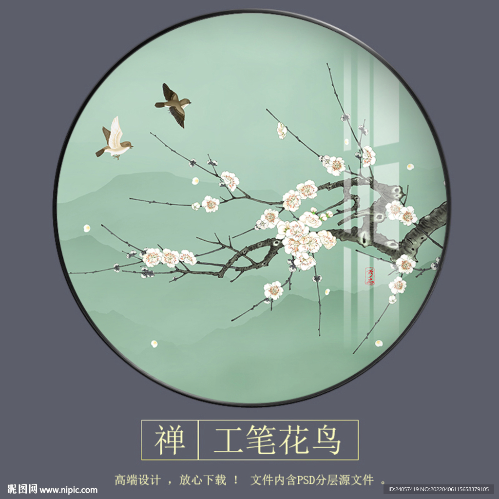 新中式工笔梅花手花鸟圆形装饰画图片