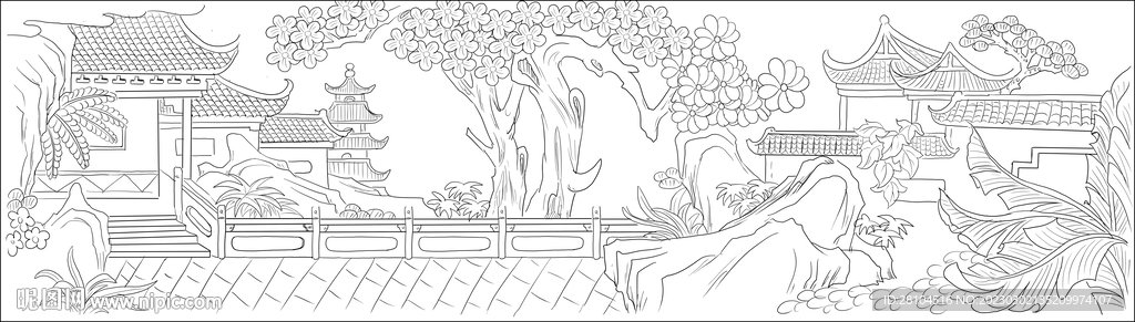 白描古建图庙图片