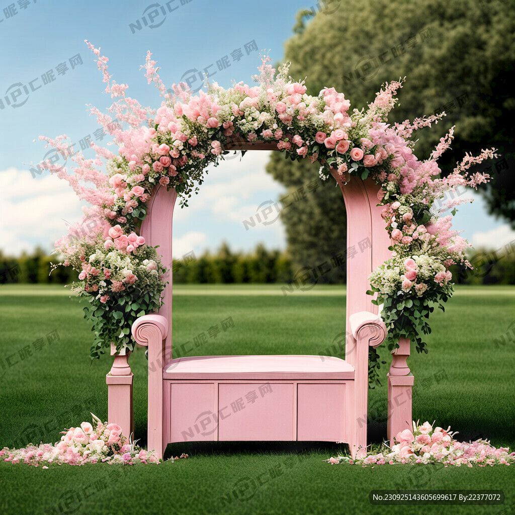 粉色草坪婚礼背景花门路引花艺木图片