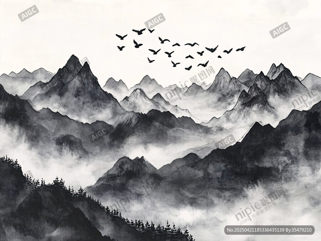 水墨群山飞鸟意境图图片