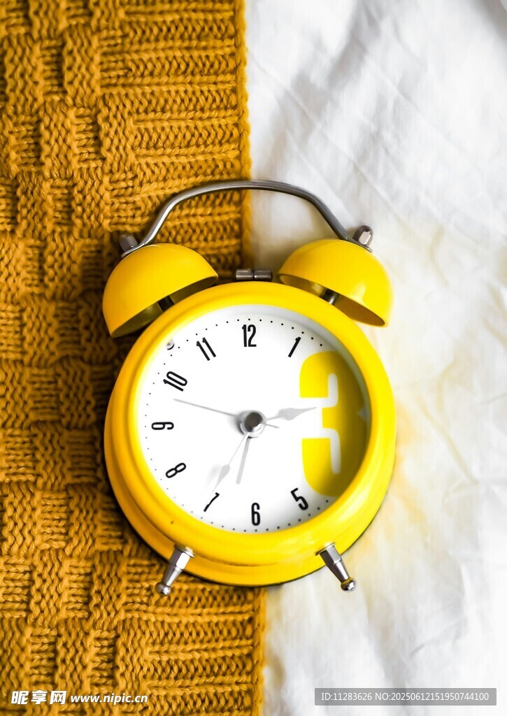 黄色复古闹钟置于织物上图片