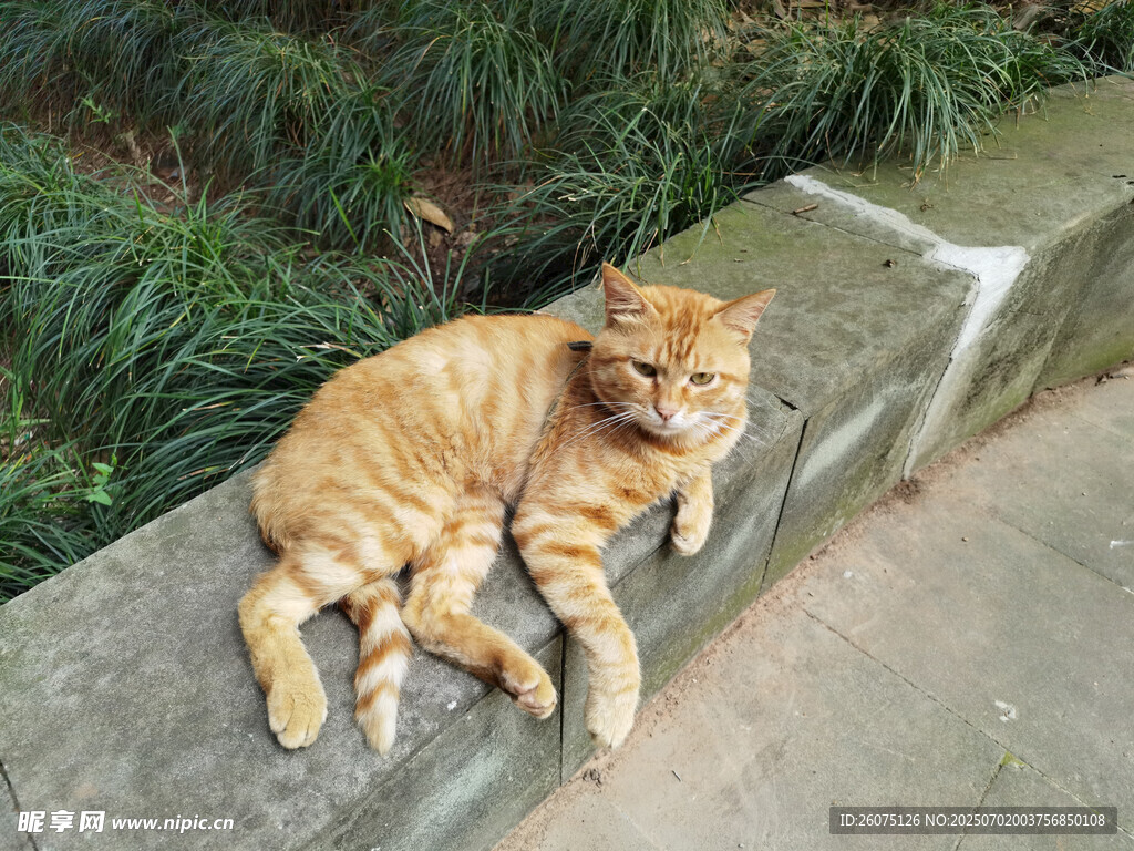 橘猫惬意趴卧在石台上图片