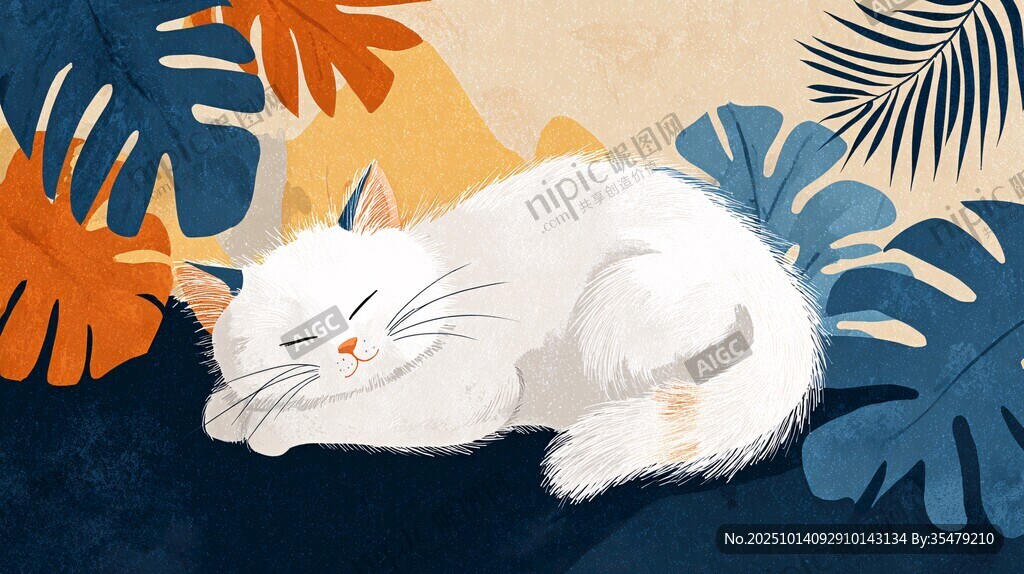 酣睡的白猫与多彩叶片图片