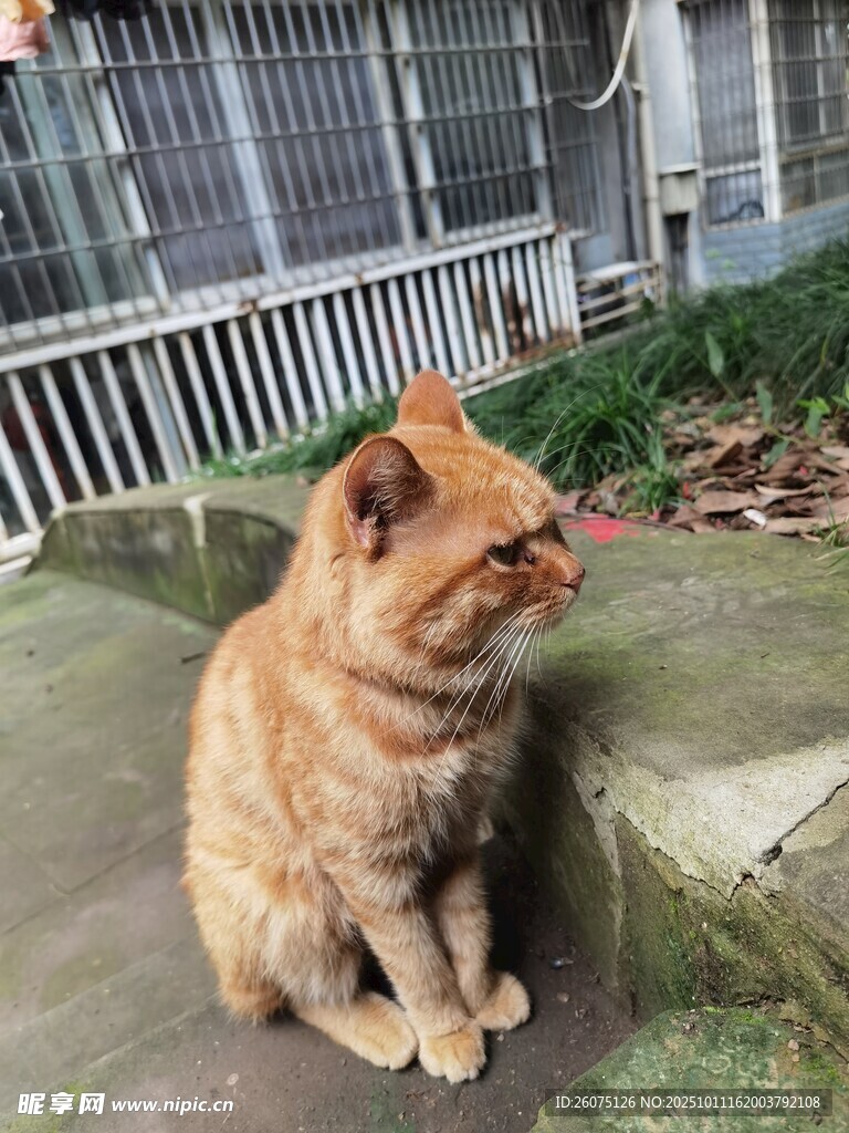 橘猫户外惬意蹲坐图片