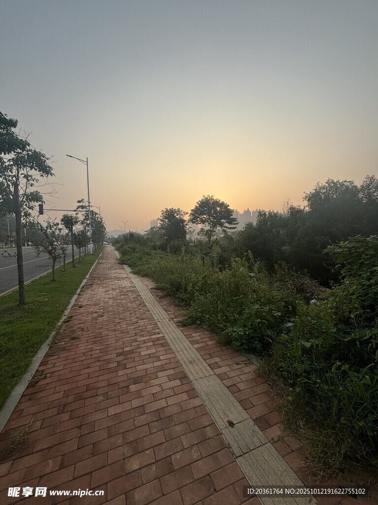 黄昏下的静谧林间小道图片