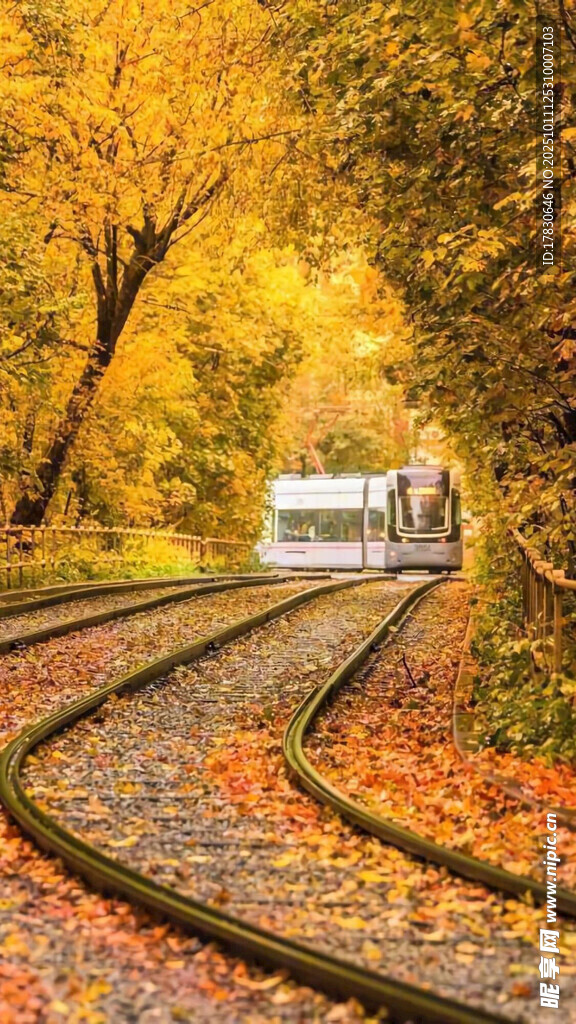 秋日铁轨旁的斑斓景致图片