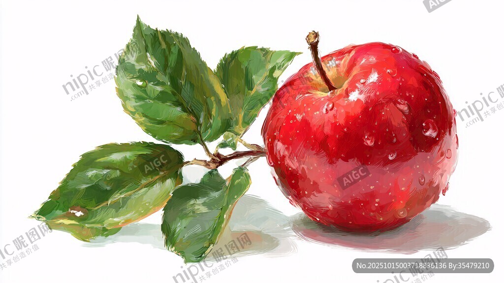 鲜红带叶苹果水彩画图片