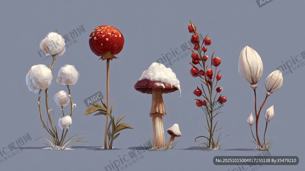 冬季植物与蘑菇梦幻组合图片