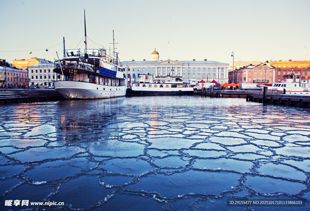 冰封港口的船只景象图片