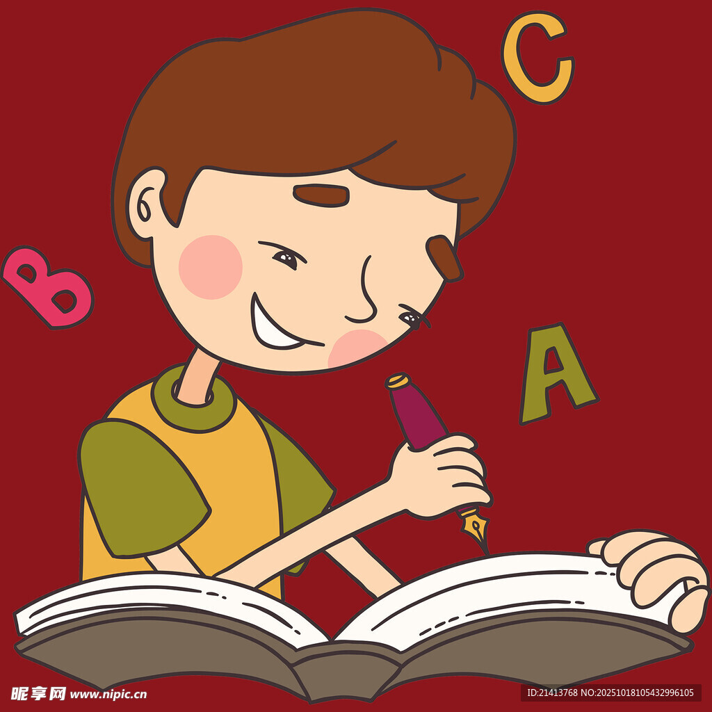 男孩开心书写翻开的书本图片