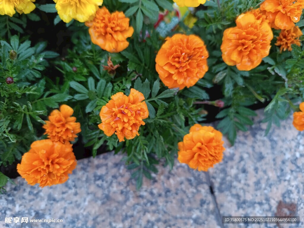 鲜艳万寿菊绽放于石旁图片