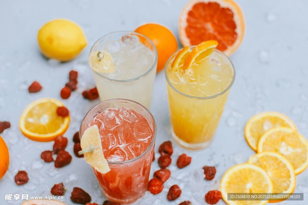 多彩鲜榨果汁与水果点缀图片