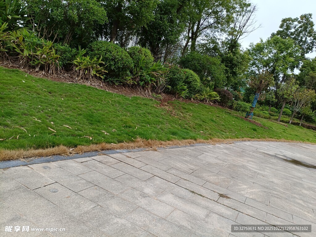 小区旁的水泥路面与绿植图片